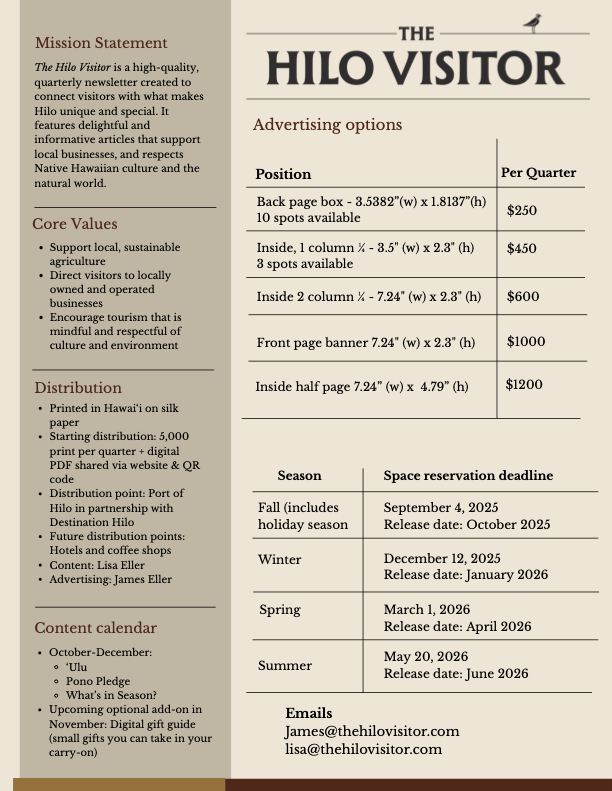 The Hilo Visitor is more than advertising, it’s a partnership. We believe in keeping it local, affordable, and community driven.